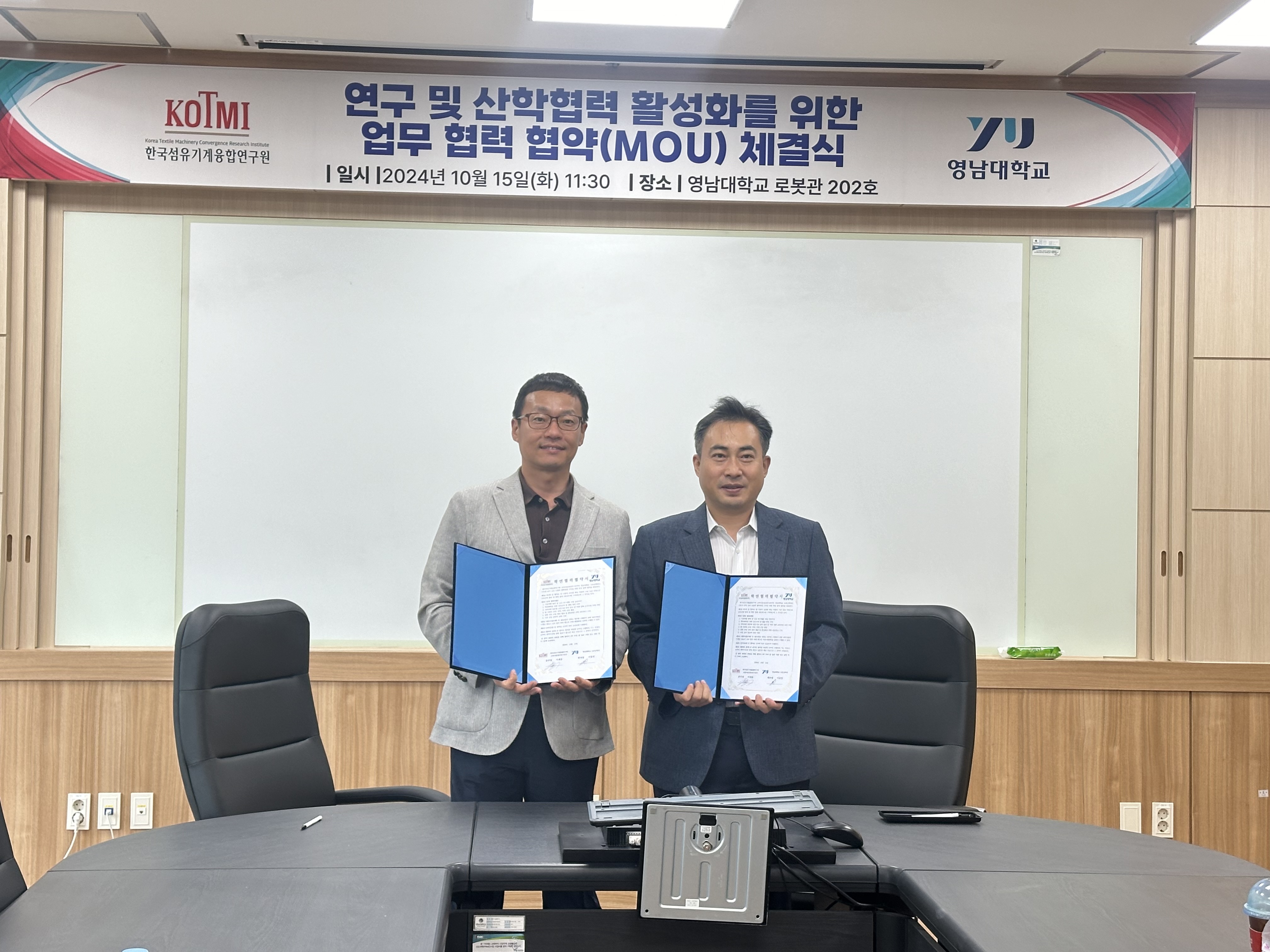 한국섬유기계융합연구원(KOTMI, 원장 성하경) 로봇자율생산연구본부(본부장 이재용)는 10월 15일(화), 경북 경산시에 소재한 영남대학교 로봇공학과(학과장 이동연, 이하 영남대)와 연구 및 산학협력 활성화를 위한 업무 협력 협약을(MOU) 체결했다.