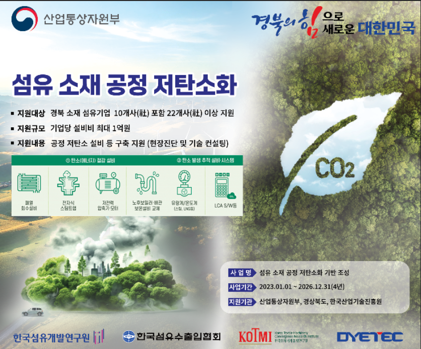 또한, 경상북도가 지원하는 ‘섬유소재 공정 저탄소화 지원사업’을 소개하며 지원기업을 모집할 예정이다.