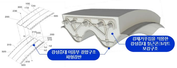 | ㅇ (업체명) ㈜픽슨 ㅇ (용도) 수로, 가교 등에 활용되는 파형강판 ㅇ (내용) 휨·압축 강성 대폭 향상 및 편토압(흙이 옹벽 등 구조물에 가하는 측면 압력), 장지간(교량 처럼 기둥 간 넓은 간격) 안정성 향상 ㅇ (특징) 경량 소재로 야적 공간 절약 및 소형 장비로도 작업이 가능하며, 강재 거푸집 적용으로 분할 타설이 가능하여 시공성 개선 ㅇ (파급효과) 편토압 등의 환경에서의 안정성 향상과 간편한 시공방식으로 경제적이고 안전한 작업환경 가능 |   | ||||