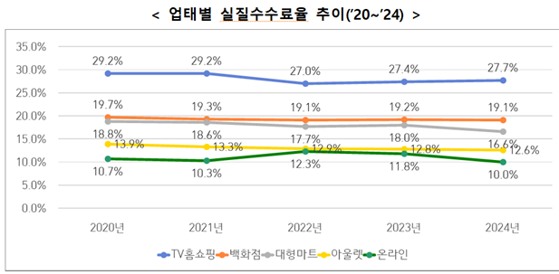 업태별 실질판매수수료율*(이하 ‘실질수수료율’)은 TV홈쇼핑 27.7%, 백화점 19.1%, 대형마트 16.6%, 아울렛·복합쇼핑몰 12.6%, 온라인쇼핑몰** 10.0% 순이며, TV홈쇼핑을 제외한 모든 업태에서 작년에 비해 하락했다.