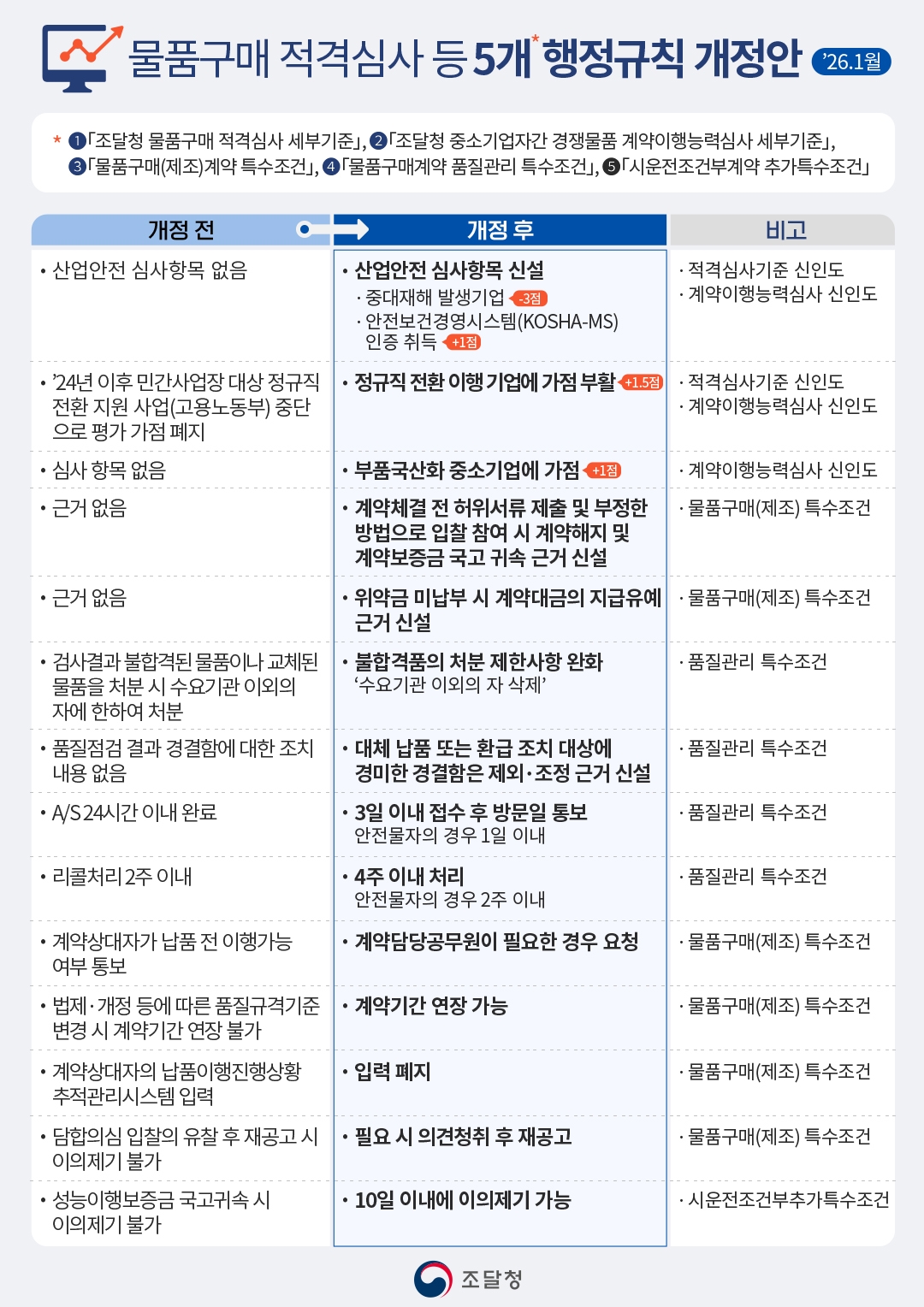 조달청(청장 백승보)은 안전한 노동환경 조성과 노동자의 고용안정, 부품 국산화 등 국정과제 이행을 지원하기 위해 ‘물품구매 적격심사 세부기준’을 포함한 5개 행정규칙을 개정해 1월 1일부터 시행했다.