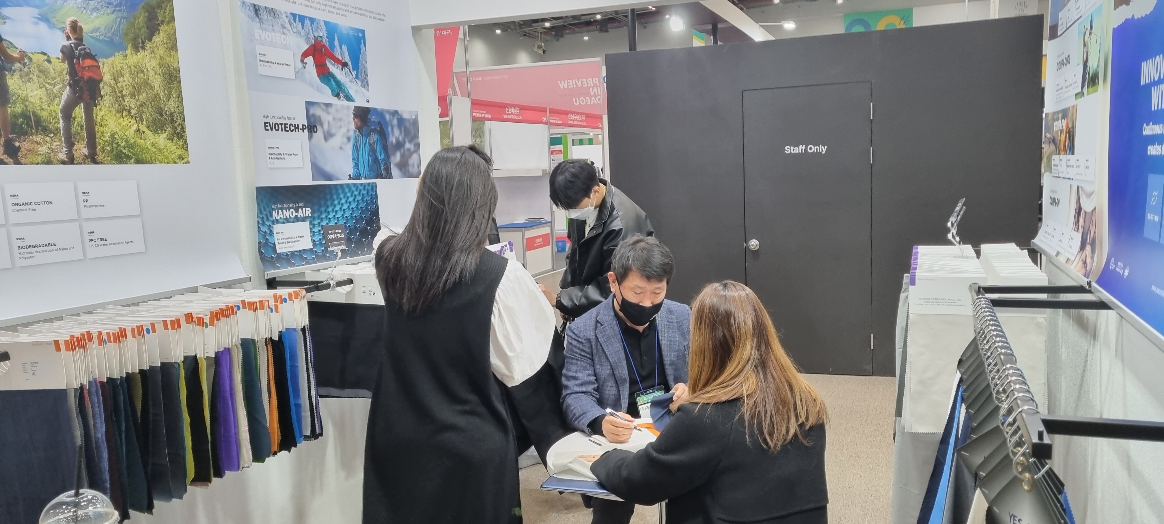 또, 동화텍스타일(주), ㈜현진니트, ㈜예스텍스타일 컨설팅랩, 우주글로벌, 부건니트, ㈜미광, ㈜아영하이텍스, 삼성교역(주), ㈜코로나텍스타일, ㈜선일, ㈜대현티에프시, 대경텍스, ㈜에스케이텍스, ㈜대웅에프엔티, ㈜명승, 태진실업(주), 이조화섬(주) 등 17개 파트너사와 공동부스를 구성해 비즈니스 상담에 임했다.